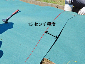 概ね15センチ程度かぶせましょう。 両方に掛るようにL型止めピンを打ち込みます。