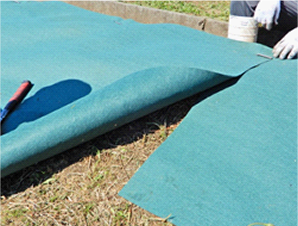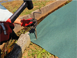 ③L型止めピンを使用して貼り付けてゆきます。 ピンはお概ね80㎝程度の間隔でしっかりと打ち込んでゆきます。